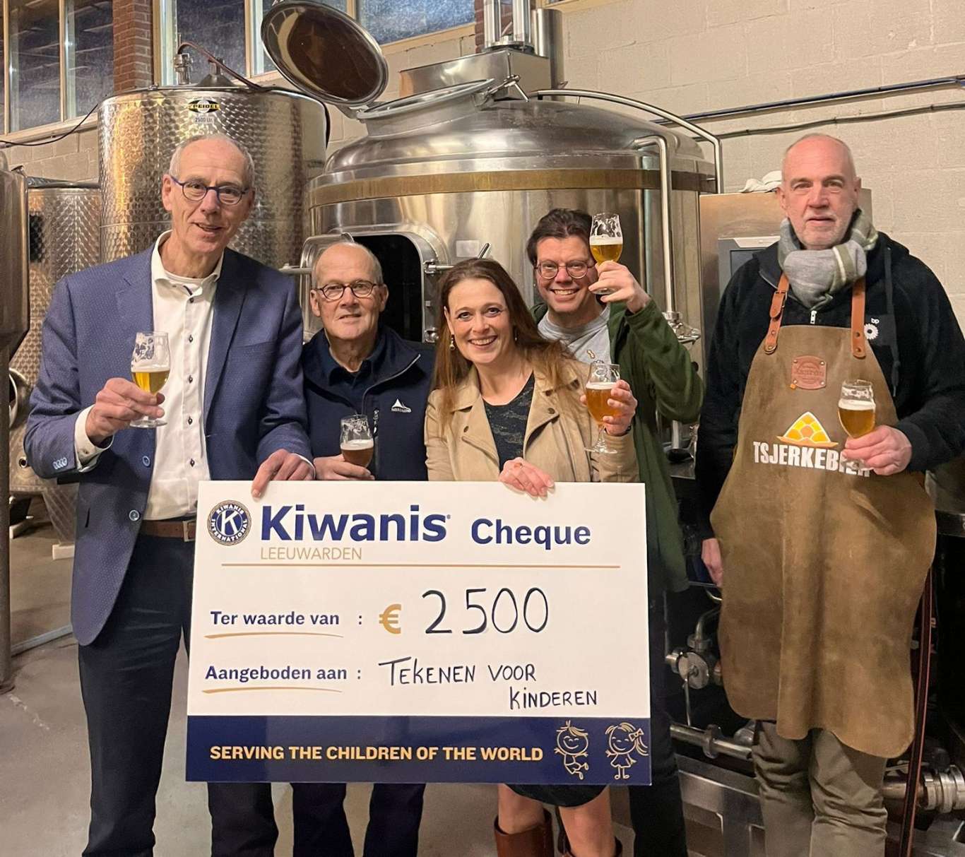 De uitreiking van de symbolische cheque vond plaats in de Brouwerij "Tsjerkebier", waar ook de leden van Kiwanis Leeuwarden hun via hun acties verkochte biertjes "Koper" en "Brons" hebben gebrouwen.